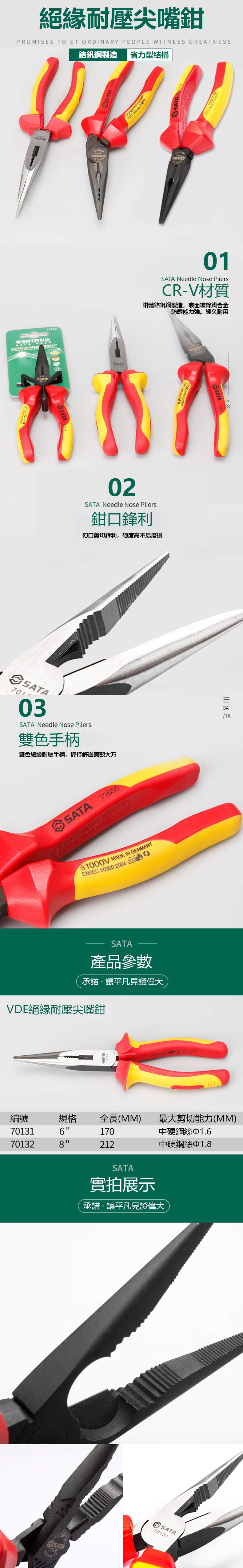 SATA|世達 VDE絕緣耐壓尖嘴鉗 8" ST70132ST
