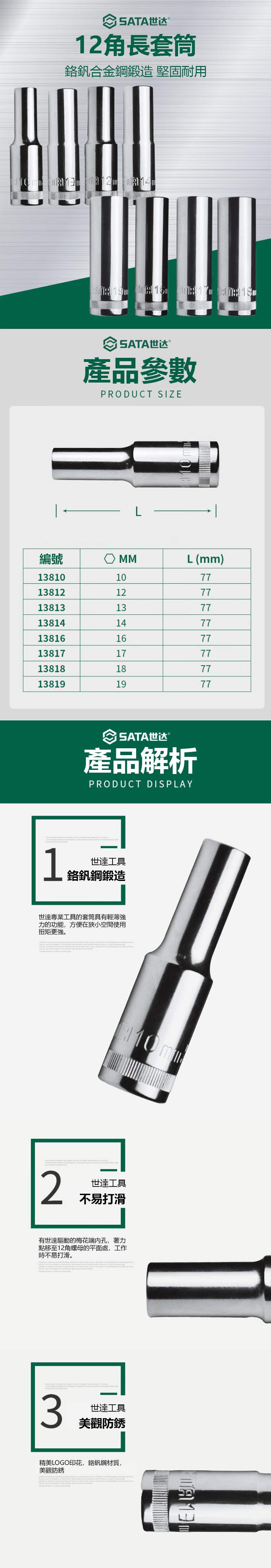 SATA|世達 12.5mm系列12角長套筒 10mm ST13810